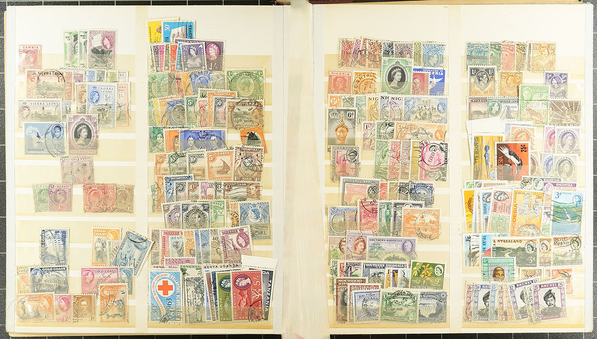 Lovely collection of used British Commonwealth material, 1880's-1960's, containing over 1,000 stamps in 8 double sided stock pages. There is a lot of nice material here, basically two countries per page with strength in West Indies, British Asia, and Africa, noting Bermuda, Bahamas, Hong Kong, Gibraltar, British Guiana, and more. Strength in post 1900 to early Elizabethan issues, including omnibus sets, etc., with some material cataloguing $5 to $20 each. A lovely lot for the British Commonwealth collector with all pages photographed online. Overall fine to very fine. Estimate =