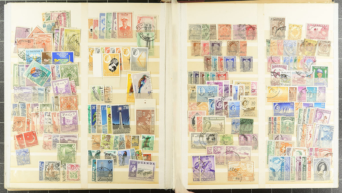 Lovely collection of used British Commonwealth material, 1880's-1960's, containing over 1,000 stamps in 8 double sided stock pages. There is a lot of nice material here, basically two countries per page with strength in West Indies, British Asia, and Africa, noting Bermuda, Bahamas, Hong Kong, Gibraltar, British Guiana, and more. Strength in post 1900 to early Elizabethan issues, including omnibus sets, etc., with some material cataloguing $5 to $20 each. A lovely lot for the British Commonwealth collector with all pages photographed online. Overall fine to very fine. Estimate =