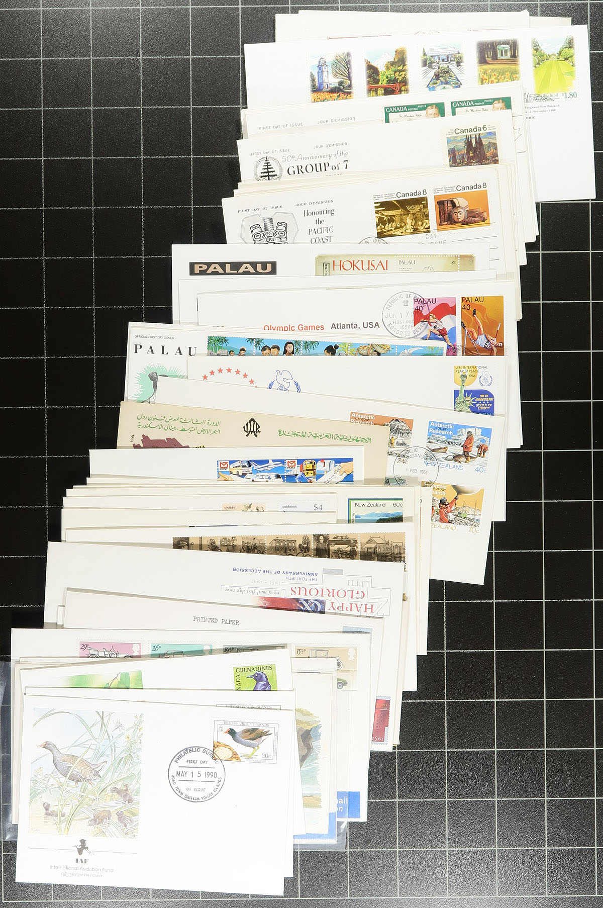 Group of roughly 400 commemorative or first day covers, generally ranging from the 1960's to the 1980's, with better representation from Canada, Great Britain, Pacific Islands, and a few from the West Indies. We note several colourful frankings with singles, sets, and a few souvenir sheets (mostly on larger sized envelopes). Ideal for the topical and thematic collector as we encountered many suitable subjects. Nice lot for collectors and dealers alike. Estimate =