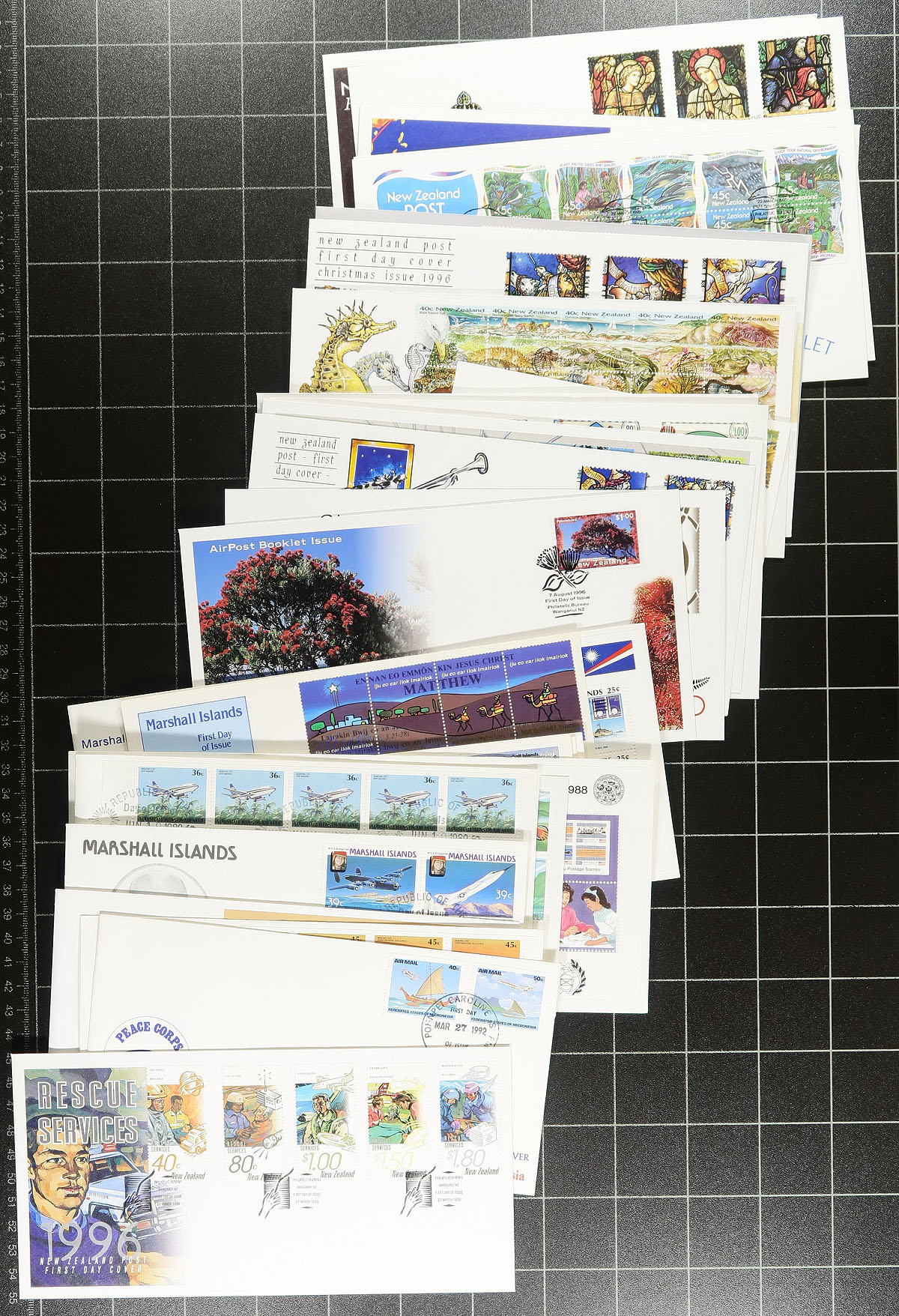 Group of roughly 400 commemorative or first day covers, generally ranging from the 1960's to the 1980's, with better representation from Canada, Great Britain, Pacific Islands, and a few from the West Indies. We note several colourful frankings with singles, sets, and a few souvenir sheets (mostly on larger sized envelopes). Ideal for the topical and thematic collector as we encountered many suitable subjects. Nice lot for collectors and dealers alike. Estimate =