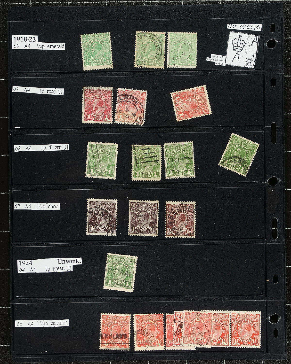 Large collection / accumulation of mint and used Australia, 1913-1987, containing several thousands of stamps in many double sided stock pages housed in a very thick binder. The lot generally ranges from Scott #1/1034, containing singles, sets, and back of the book issues, with most stamps identified by the owner. The lot begins with roughly 140 used Kangaroo issues (including #43-44), and a few hundred KGV Heads, all with a variety of watermark types, along with a few 'OS' perforated issues. The lot continues with a mix of mint and used issues from the 1930s onwards with a probable few hundred dollars worth of face value stamps. A nice lot for the specialist and a potentially high cataloguing lot, as a spot check indicated some stamps cataloguing $10 to $30 and up each. A few faults with a few stamps, overall fine to very fine. Estimate =