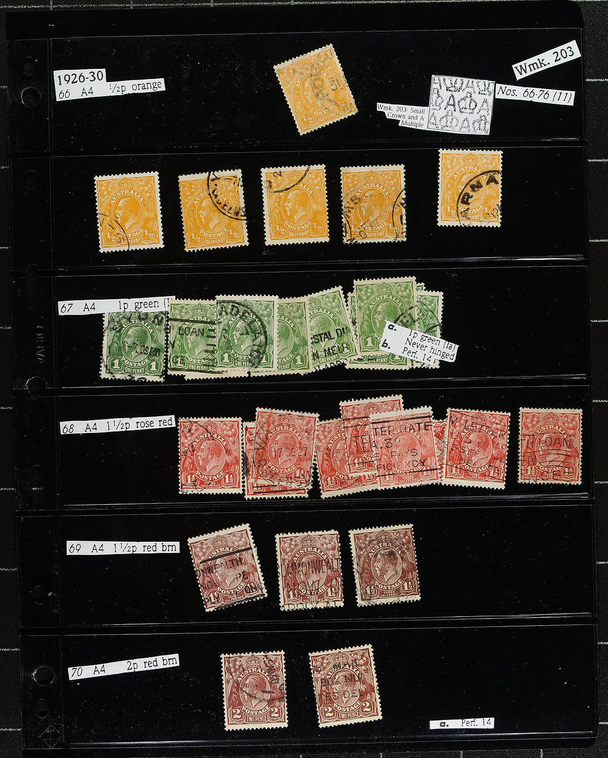 Large collection / accumulation of mint and used Australia, 1913-1987, containing several thousands of stamps in many double sided stock pages housed in a very thick binder. The lot generally ranges from Scott #1/1034, containing singles, sets, and back of the book issues, with most stamps identified by the owner. The lot begins with roughly 140 used Kangaroo issues (including #43-44), and a few hundred KGV Heads, all with a variety of watermark types, along with a few 'OS' perforated issues. The lot continues with a mix of mint and used issues from the 1930s onwards with a probable few hundred dollars worth of face value stamps. A nice lot for the specialist and a potentially high cataloguing lot, as a spot check indicated some stamps cataloguing $10 to $30 and up each. A few faults with a few stamps, overall fine to very fine. Estimate =