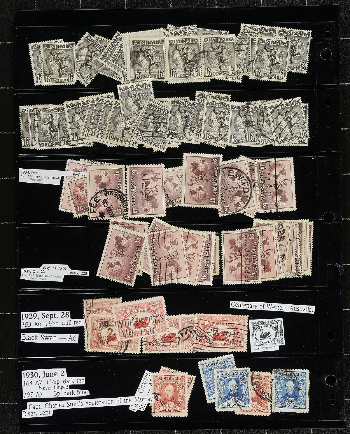 Large collection / accumulation of mint and used Australia, 1913-1987, containing several thousands of stamps in many double sided stock pages housed in a very thick binder. The lot generally ranges from Scott #1/1034, containing singles, sets, and back of the book issues, with most stamps identified by the owner. The lot begins with roughly 140 used Kangaroo issues (including #43-44), and a few hundred KGV Heads, all with a variety of watermark types, along with a few 'OS' perforated issues. The lot continues with a mix of mint and used issues from the 1930s onwards with a probable few hundred dollars worth of face value stamps. A nice lot for the specialist and a potentially high cataloguing lot, as a spot check indicated some stamps cataloguing $10 to $30 and up each. A few faults with a few stamps, overall fine to very fine. Estimate =