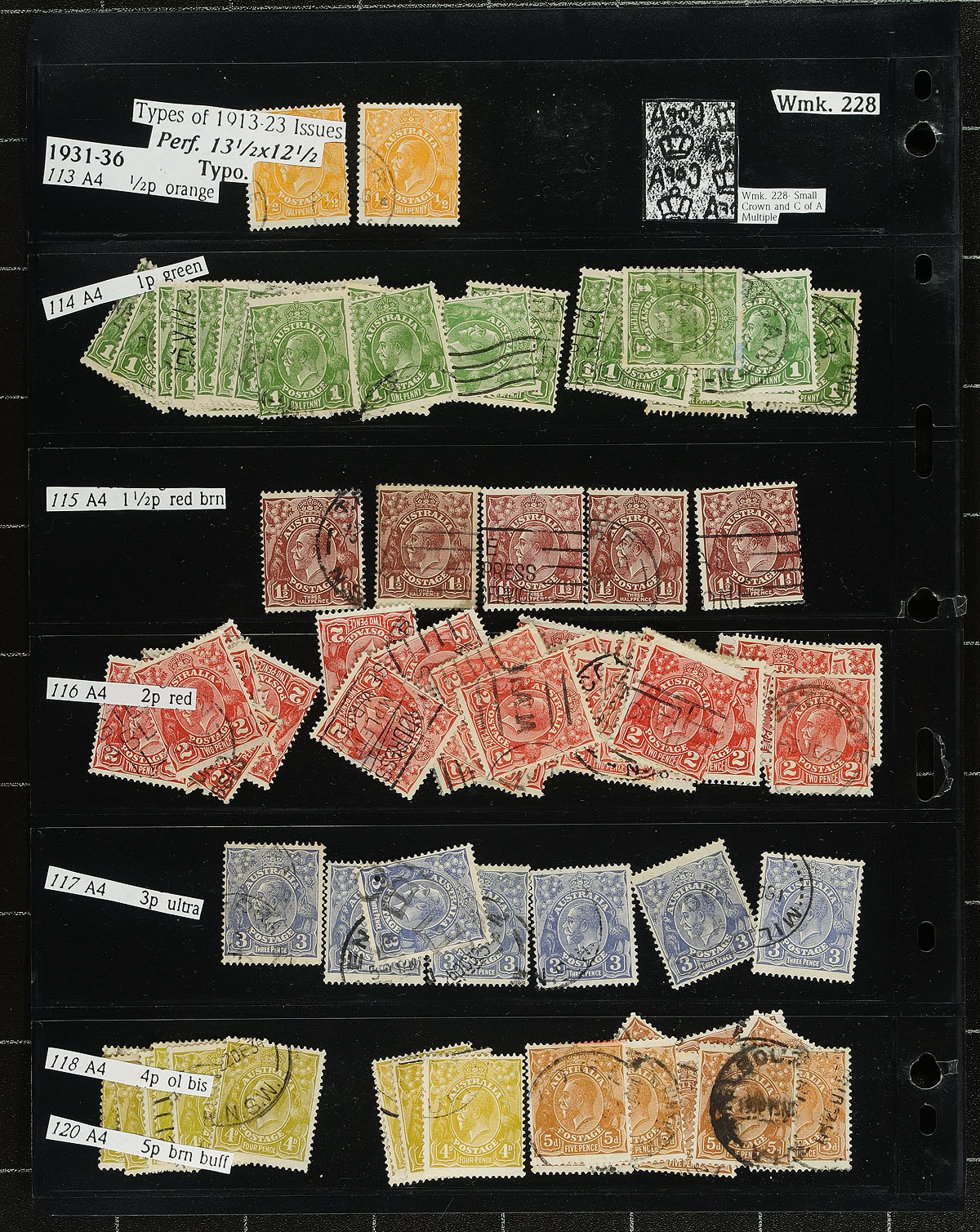 Large collection / accumulation of mint and used Australia, 1913-1987, containing several thousands of stamps in many double sided stock pages housed in a very thick binder. The lot generally ranges from Scott #1/1034, containing singles, sets, and back of the book issues, with most stamps identified by the owner. The lot begins with roughly 140 used Kangaroo issues (including #43-44), and a few hundred KGV Heads, all with a variety of watermark types, along with a few 'OS' perforated issues. The lot continues with a mix of mint and used issues from the 1930s onwards with a probable few hundred dollars worth of face value stamps. A nice lot for the specialist and a potentially high cataloguing lot, as a spot check indicated some stamps cataloguing $10 to $30 and up each. A few faults with a few stamps, overall fine to very fine. Estimate =