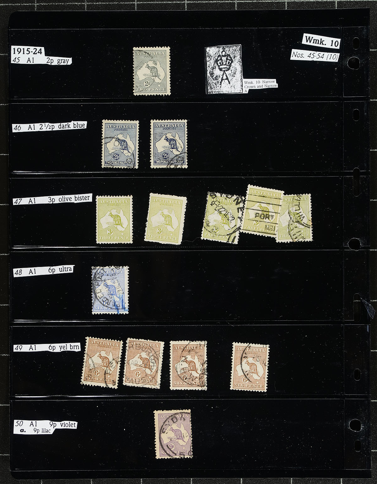 Large collection / accumulation of mint and used Australia, 1913-1987, containing several thousands of stamps in many double sided stock pages housed in a very thick binder. The lot generally ranges from Scott #1/1034, containing singles, sets, and back of the book issues, with most stamps identified by the owner. The lot begins with roughly 140 used Kangaroo issues (including #43-44), and a few hundred KGV Heads, all with a variety of watermark types, along with a few 'OS' perforated issues. The lot continues with a mix of mint and used issues from the 1930s onwards with a probable few hundred dollars worth of face value stamps. A nice lot for the specialist and a potentially high cataloguing lot, as a spot check indicated some stamps cataloguing $10 to $30 and up each. A few faults with a few stamps, overall fine to very fine. Estimate =