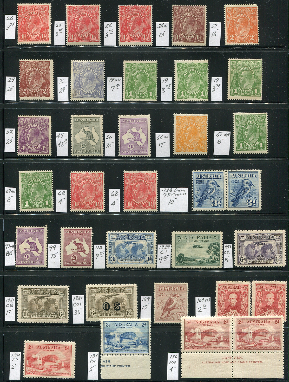 Group of 69 mint Australia stamps, 1914-1966, neatly organized on a double sided stock page. The lot ranges from Scott #26/415, all neatly laid out, identified and catalogued using current Scott pricing, noting a good number of singles and partial sets cataloguing $10 to $30 and up. A nice group to start that Australia classic era mint collection. 2026 Scott US$750.75 =