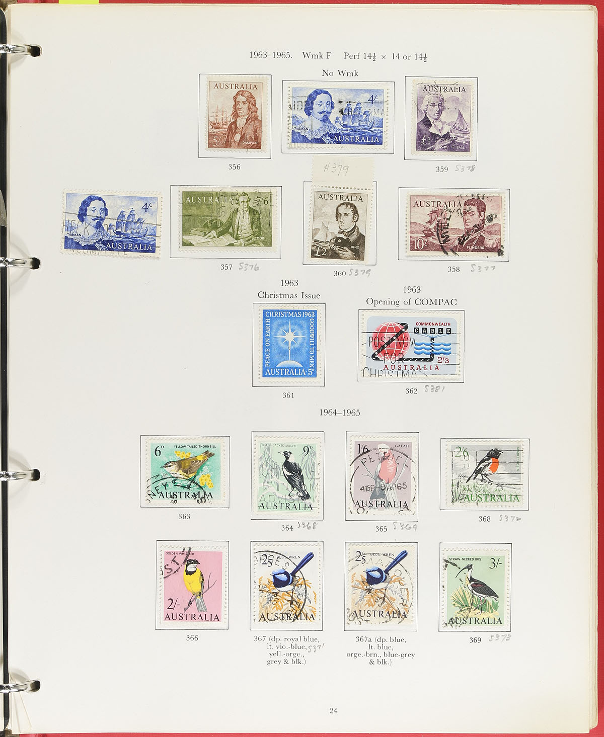 Nice collection of used Australia, 1913-1988, containing many hundreds of stamps in a Stanley Gibbons album. The collection generally ranges from Scott #1/1167 containing singles, sets, partial sets, and back of the book material. The collection contains a good selection of roughly 40 Kangaroos and 100 KGV Heads, along with a few better sets from the 1930s. A spot check indicated some material cataloguing from $10 to $20 each, with the owner's 2019 Scott catalogue value for the collection totaling US$804.00. A nice lot for the Australia or Commonwealth collector. A few faults with a few of the early stamps, overall fine to very fine. Estimate =