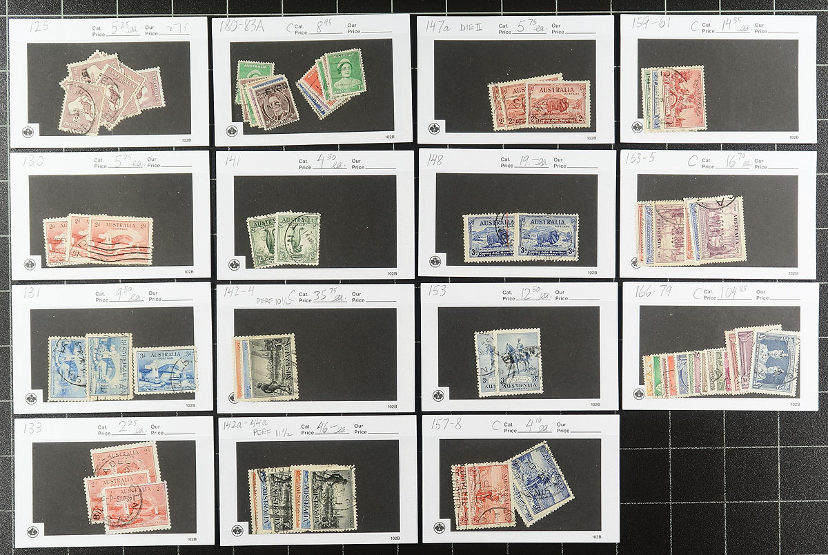 Well organized, small bundle of "102" cards with individually identified and priced used early Aussie issues, with strength in ‘Roos and King George V "Heads" and going up to the pound1 "Robe". Most have 1-5 copies, with a number of nice cancels. We don’t believe that they have been looked at for plate flaws. Most appear sound but there are a couple with condition issues that should not have been counted. A small part of the owner’s 2020 Scott catalogue value of US$2006.25. We are giving it an estimated value. Estimate =