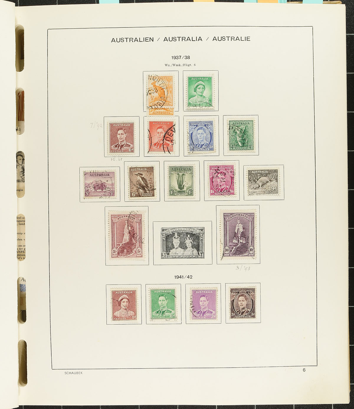 Large collection of primarily used Australia, 1913-1993, containing over 1,000 stamps in a thick Schaubek album. This well organized collection ranges from Scott #1/1354, containing singles, sets, partial sets, souvenir sheets, back of the book, and a selection of Antarctic Territory stamps. The strength of the collection is the used material up to the 1950s, with a mixture of mint and or used examples from the 1970s up to the 1980s, noting roughly 27 Kangaroos including #s 6,8-10 (c.v. $130 total), 38-39, 41 ($101 total), with a further spot check indicating material $10 to $20 and up each. We estimate face value to be $100 and up. A very collection that should be continued until the album is filled (pages up to 1993), overall fine to very fine. Estimate =