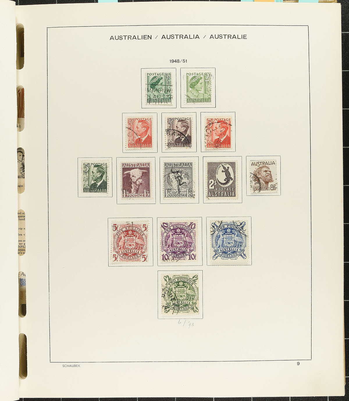 Large collection of primarily used Australia, 1913-1993, containing over 1,000 stamps in a thick Schaubek album. This well organized collection ranges from Scott #1/1354, containing singles, sets, partial sets, souvenir sheets, back of the book, and a selection of Antarctic Territory stamps. The strength of the collection is the used material up to the 1950s, with a mixture of mint and or used examples from the 1970s up to the 1980s, noting roughly 27 Kangaroos including #s 6,8-10 (c.v. $130 total), 38-39, 41 ($101 total), with a further spot check indicating material $10 to $20 and up each. We estimate face value to be $100 and up. A very collection that should be continued until the album is filled (pages up to 1993), overall fine to very fine. Estimate =