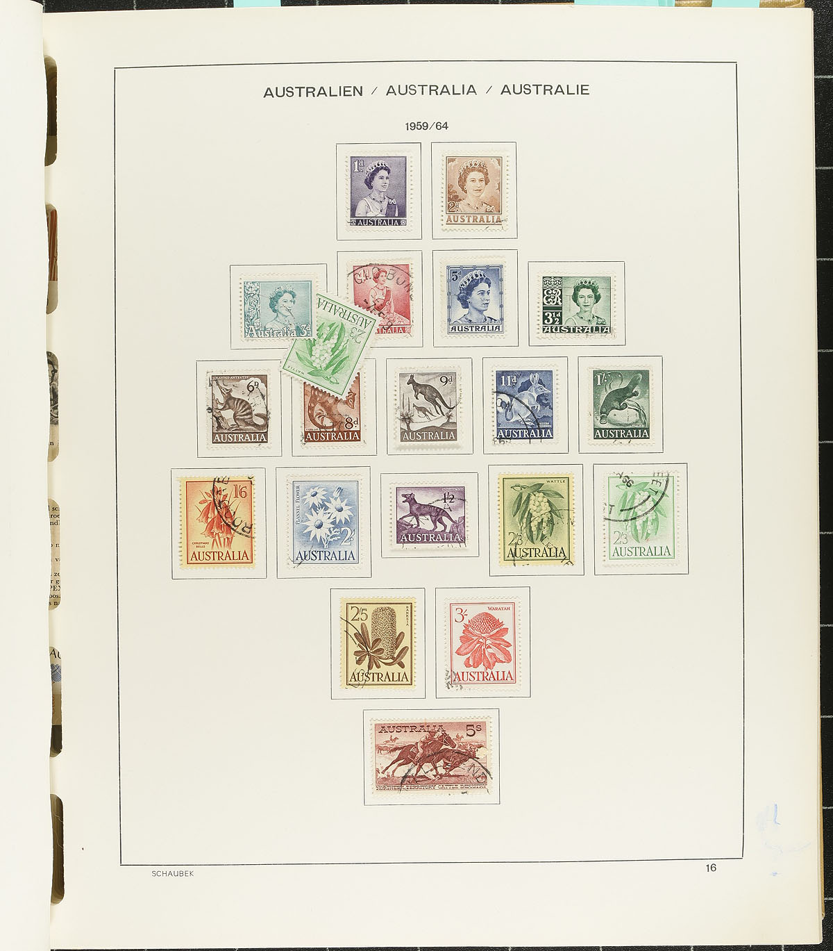 Large collection of primarily used Australia, 1913-1993, containing over 1,000 stamps in a thick Schaubek album. This well organized collection ranges from Scott #1/1354, containing singles, sets, partial sets, souvenir sheets, back of the book, and a selection of Antarctic Territory stamps. The strength of the collection is the used material up to the 1950s, with a mixture of mint and or used examples from the 1970s up to the 1980s, noting roughly 27 Kangaroos including #s 6,8-10 (c.v. $130 total), 38-39, 41 ($101 total), with a further spot check indicating material $10 to $20 and up each. We estimate face value to be $100 and up. A very collection that should be continued until the album is filled (pages up to 1993), overall fine to very fine. Estimate =