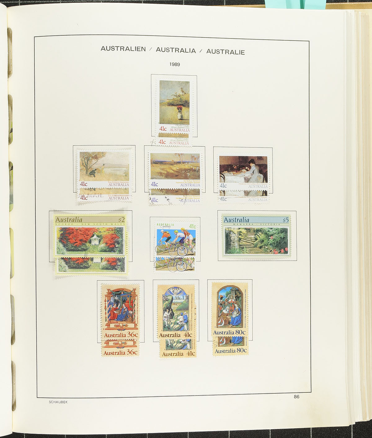 Large collection of primarily used Australia, 1913-1993, containing over 1,000 stamps in a thick Schaubek album. This well organized collection ranges from Scott #1/1354, containing singles, sets, partial sets, souvenir sheets, back of the book, and a selection of Antarctic Territory stamps. The strength of the collection is the used material up to the 1950s, with a mixture of mint and or used examples from the 1970s up to the 1980s, noting roughly 27 Kangaroos including #s 6,8-10 (c.v. $130 total), 38-39, 41 ($101 total), with a further spot check indicating material $10 to $20 and up each. We estimate face value to be $100 and up. A very collection that should be continued until the album is filled (pages up to 1993), overall fine to very fine. Estimate =