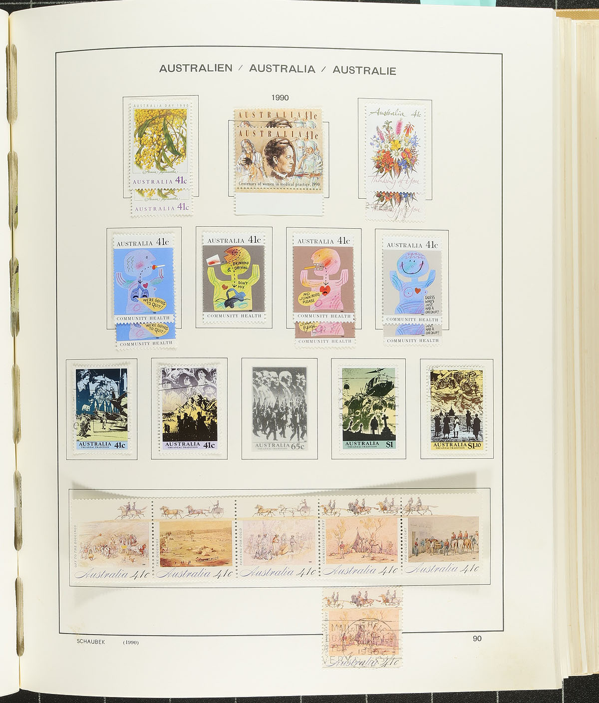 Large collection of primarily used Australia, 1913-1993, containing over 1,000 stamps in a thick Schaubek album. This well organized collection ranges from Scott #1/1354, containing singles, sets, partial sets, souvenir sheets, back of the book, and a selection of Antarctic Territory stamps. The strength of the collection is the used material up to the 1950s, with a mixture of mint and or used examples from the 1970s up to the 1980s, noting roughly 27 Kangaroos including #s 6,8-10 (c.v. $130 total), 38-39, 41 ($101 total), with a further spot check indicating material $10 to $20 and up each. We estimate face value to be $100 and up. A very collection that should be continued until the album is filled (pages up to 1993), overall fine to very fine. Estimate =