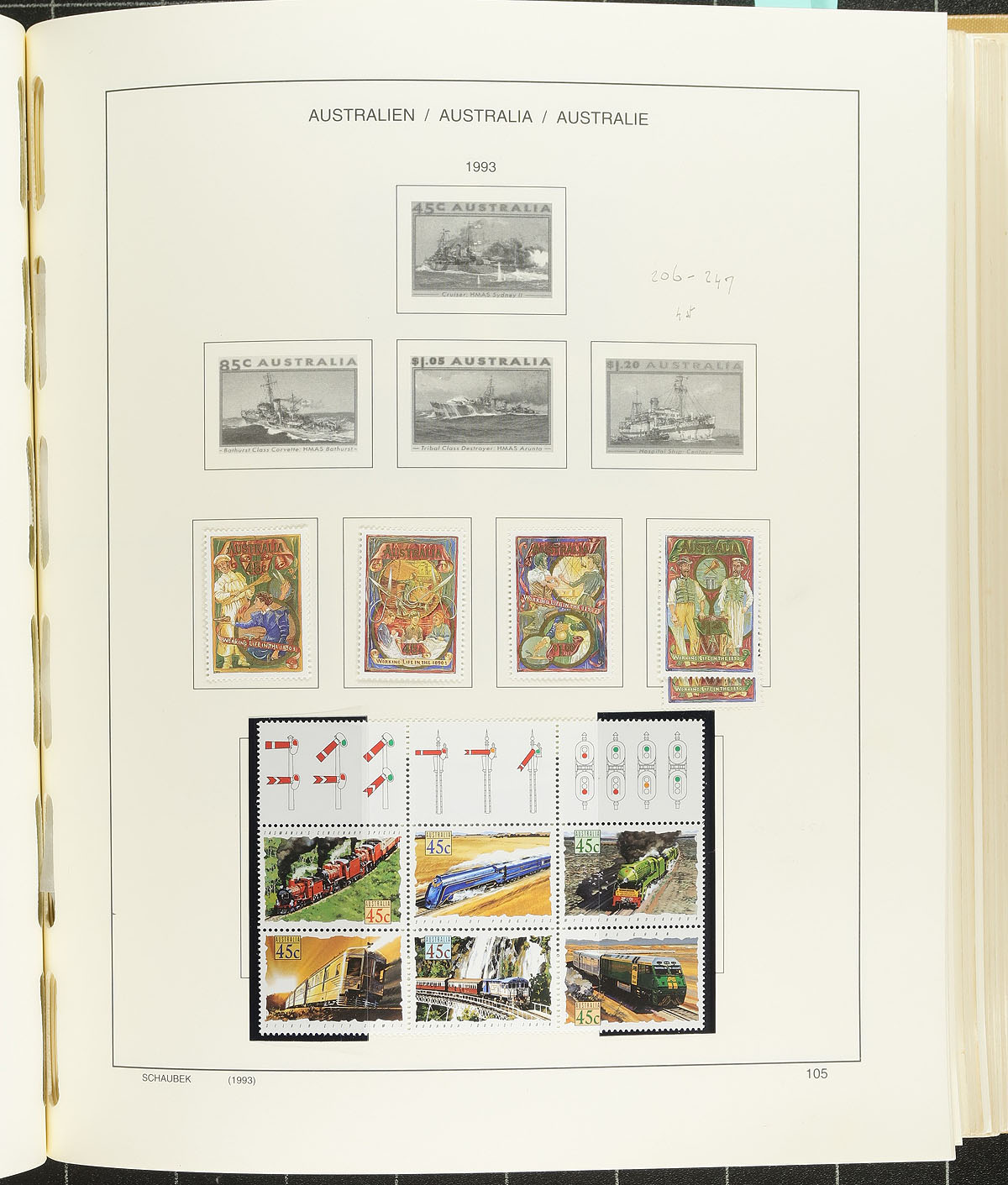 Large collection of primarily used Australia, 1913-1993, containing over 1,000 stamps in a thick Schaubek album. This well organized collection ranges from Scott #1/1354, containing singles, sets, partial sets, souvenir sheets, back of the book, and a selection of Antarctic Territory stamps. The strength of the collection is the used material up to the 1950s, with a mixture of mint and or used examples from the 1970s up to the 1980s, noting roughly 27 Kangaroos including #s 6,8-10 (c.v. $130 total), 38-39, 41 ($101 total), with a further spot check indicating material $10 to $20 and up each. We estimate face value to be $100 and up. A very collection that should be continued until the album is filled (pages up to 1993), overall fine to very fine. Estimate =
