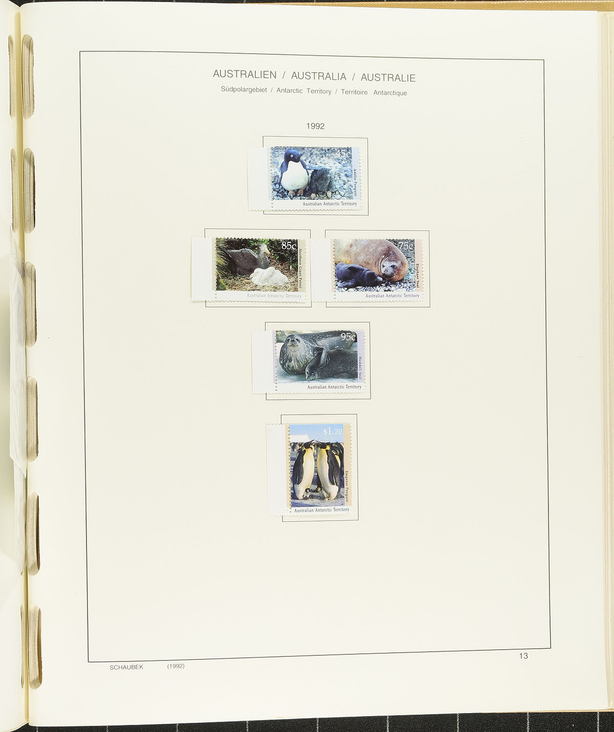 Large collection of primarily used Australia, 1913-1993, containing over 1,000 stamps in a thick Schaubek album. This well organized collection ranges from Scott #1/1354, containing singles, sets, partial sets, souvenir sheets, back of the book, and a selection of Antarctic Territory stamps. The strength of the collection is the used material up to the 1950s, with a mixture of mint and or used examples from the 1970s up to the 1980s, noting roughly 27 Kangaroos including #s 6,8-10 (c.v. $130 total), 38-39, 41 ($101 total), with a further spot check indicating material $10 to $20 and up each. We estimate face value to be $100 and up. A very collection that should be continued until the album is filled (pages up to 1993), overall fine to very fine. Estimate =