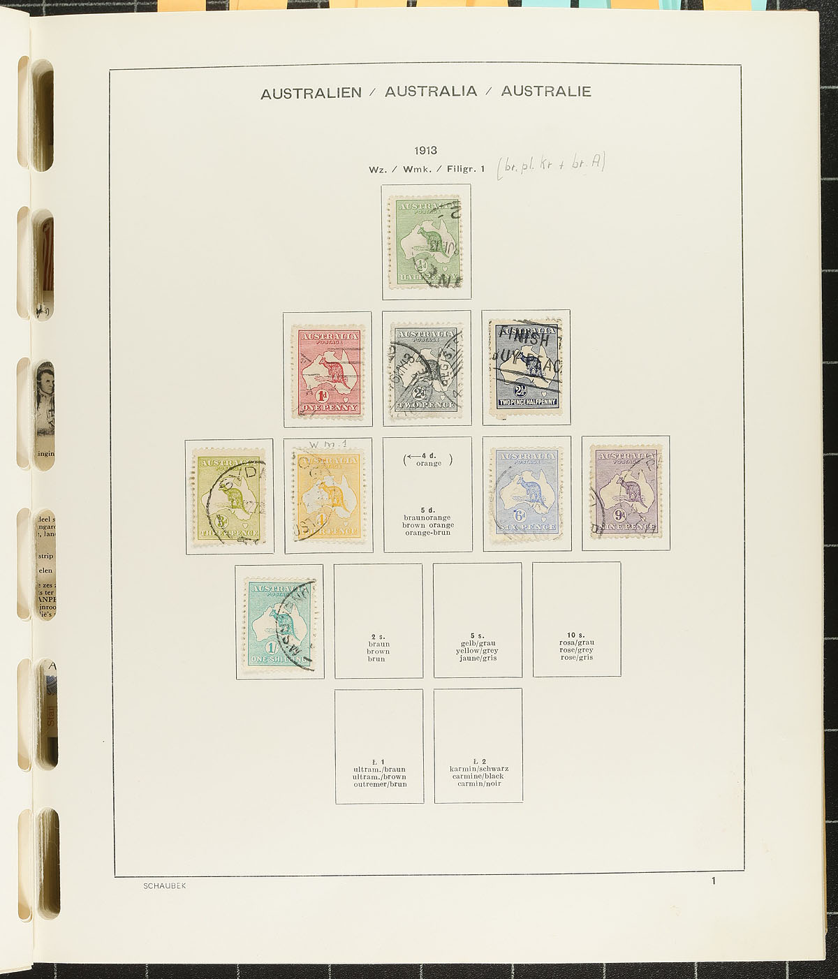 Large collection of primarily used Australia, 1913-1993, containing over 1,000 stamps in a thick Schaubek album. This well organized collection ranges from Scott #1/1354, containing singles, sets, partial sets, souvenir sheets, back of the book, and a selection of Antarctic Territory stamps. The strength of the collection is the used material up to the 1950s, with a mixture of mint and or used examples from the 1970s up to the 1980s, noting roughly 27 Kangaroos including #s 6,8-10 (c.v. $130 total), 38-39, 41 ($101 total), with a further spot check indicating material $10 to $20 and up each. We estimate face value to be $100 and up. A very collection that should be continued until the album is filled (pages up to 1993), overall fine to very fine. Estimate =