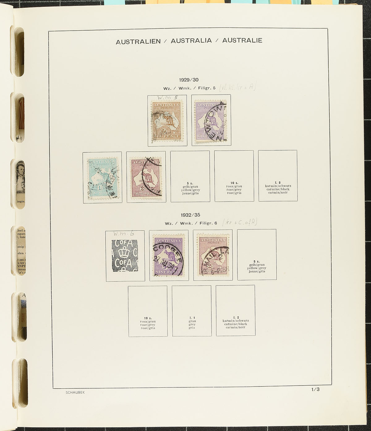 Large collection of primarily used Australia, 1913-1993, containing over 1,000 stamps in a thick Schaubek album. This well organized collection ranges from Scott #1/1354, containing singles, sets, partial sets, souvenir sheets, back of the book, and a selection of Antarctic Territory stamps. The strength of the collection is the used material up to the 1950s, with a mixture of mint and or used examples from the 1970s up to the 1980s, noting roughly 27 Kangaroos including #s 6,8-10 (c.v. $130 total), 38-39, 41 ($101 total), with a further spot check indicating material $10 to $20 and up each. We estimate face value to be $100 and up. A very collection that should be continued until the album is filled (pages up to 1993), overall fine to very fine. Estimate =