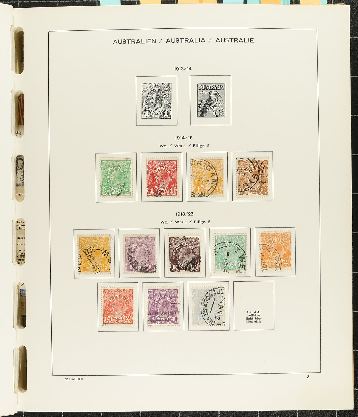 Large collection of primarily used Australia, 1913-1993, containing over 1,000 stamps in a thick Schaubek album. This well organized collection ranges from Scott #1/1354, containing singles, sets, partial sets, souvenir sheets, back of the book, and a selection of Antarctic Territory stamps. The strength of the collection is the used material up to the 1950s, with a mixture of mint and or used examples from the 1970s up to the 1980s, noting roughly 27 Kangaroos including #s 6,8-10 (c.v. $130 total), 38-39, 41 ($101 total), with a further spot check indicating material $10 to $20 and up each. We estimate face value to be $100 and up. A very collection that should be continued until the album is filled (pages up to 1993), overall fine to very fine. Estimate =