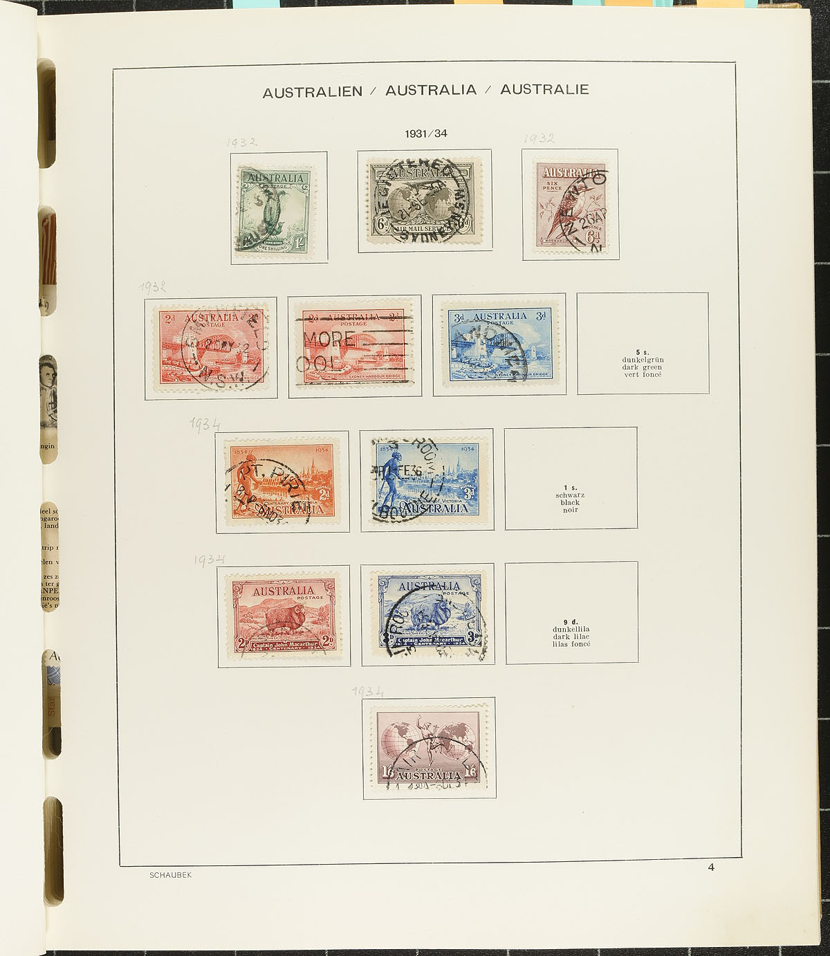 Large collection of primarily used Australia, 1913-1993, containing over 1,000 stamps in a thick Schaubek album. This well organized collection ranges from Scott #1/1354, containing singles, sets, partial sets, souvenir sheets, back of the book, and a selection of Antarctic Territory stamps. The strength of the collection is the used material up to the 1950s, with a mixture of mint and or used examples from the 1970s up to the 1980s, noting roughly 27 Kangaroos including #s 6,8-10 (c.v. $130 total), 38-39, 41 ($101 total), with a further spot check indicating material $10 to $20 and up each. We estimate face value to be $100 and up. A very collection that should be continued until the album is filled (pages up to 1993), overall fine to very fine. Estimate =