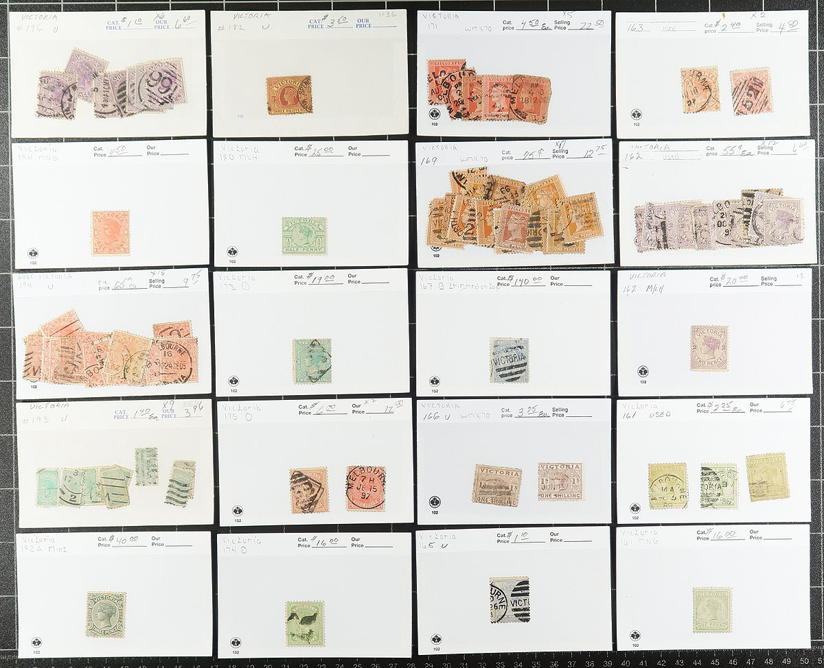 Group of mint and used stamps in roughly 80 dealer 102 cards, generally ranging from the late 1850's to 1912. The group ranges from Scott #3/232 along with a few postage due issues, with each card identified by Scott numbers and have older catalogue values, typically one stamp per card, with a few ranging from 2 to 5 stamps per card. Most of the cards have catalogue values ranging from to $4 to $20 each and up, with a total value of $976.20 for the lot (a few stamps were not counted due to obvious faults). A few small faults with a few stamps, still a nice lot for the Australia or Commonwealth collector, overall fine to very fine. Estimate =