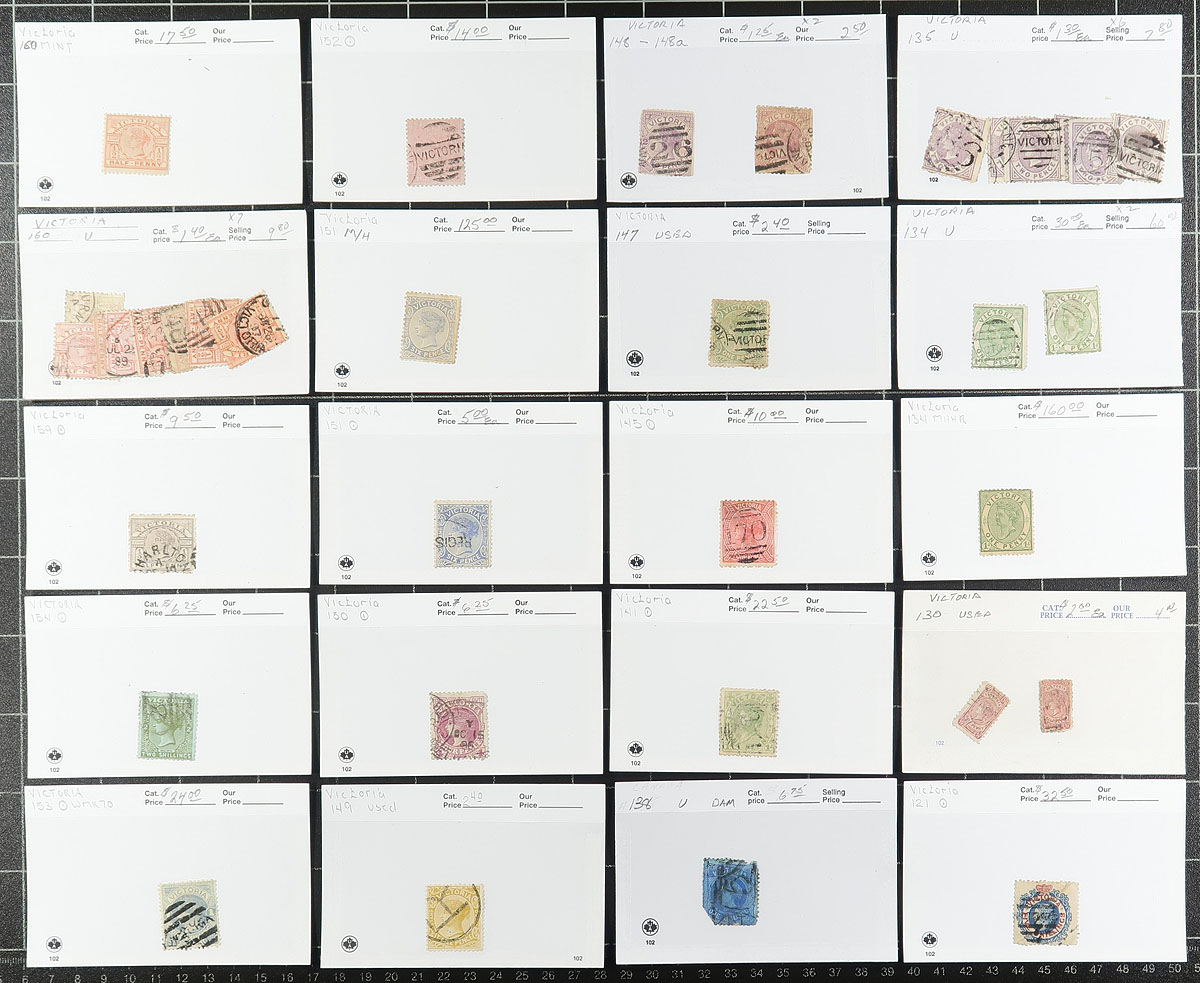 Group of mint and used stamps in roughly 80 dealer 102 cards, generally ranging from the late 1850's to 1912. The group ranges from Scott #3/232 along with a few postage due issues, with each card identified by Scott numbers and have older catalogue values, typically one stamp per card, with a few ranging from 2 to 5 stamps per card. Most of the cards have catalogue values ranging from to $4 to $20 each and up, with a total value of $976.20 for the lot (a few stamps were not counted due to obvious faults). A few small faults with a few stamps, still a nice lot for the Australia or Commonwealth collector, overall fine to very fine. Estimate =