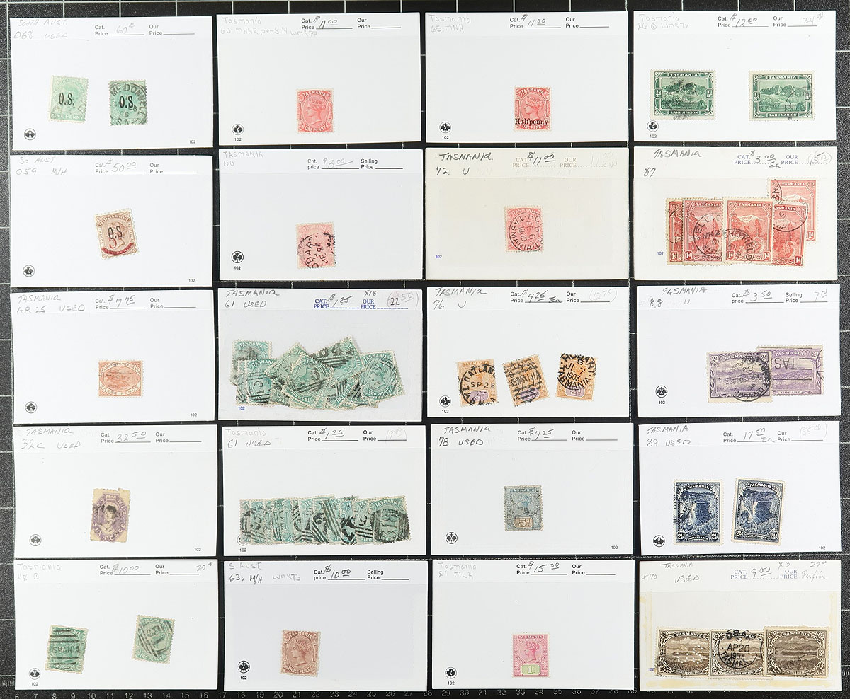 Group of mint and used stamps in roughly 130 dealer 102 cards, generally ranging from the late 1860's to 1900's. The group has representation from all the states, except Victoria, with each card identified by Scott numbers and have older catalogue values, typically one stamp per card, with a few ranging from 2 to 5 stamps per card. Most of the cards have catalogue values ranging from to $4 to $20 each and up, with a total value of US$1,131.65. A few small faults with a few stamps, still a nice lot for the Australia or Commonwealth collector, overall fine to very fine. Estimate =