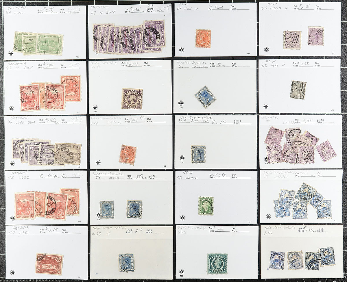 Group of mint and used stamps in roughly 130 dealer 102 cards, generally ranging from the late 1860's to 1900's. The group has representation from all the states, except Victoria, with each card identified by Scott numbers and have older catalogue values, typically one stamp per card, with a few ranging from 2 to 5 stamps per card. Most of the cards have catalogue values ranging from to $4 to $20 each and up, with a total value of US$1,131.65. A few small faults with a few stamps, still a nice lot for the Australia or Commonwealth collector, overall fine to very fine. Estimate =
