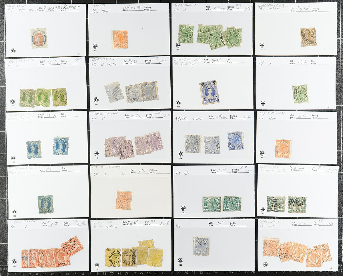 Group of mint and used stamps in roughly 130 dealer 102 cards, generally ranging from the late 1860's to 1900's. The group has representation from all the states, except Victoria, with each card identified by Scott numbers and have older catalogue values, typically one stamp per card, with a few ranging from 2 to 5 stamps per card. Most of the cards have catalogue values ranging from to $4 to $20 each and up, with a total value of US$1,131.65. A few small faults with a few stamps, still a nice lot for the Australia or Commonwealth collector, overall fine to very fine. Estimate =
