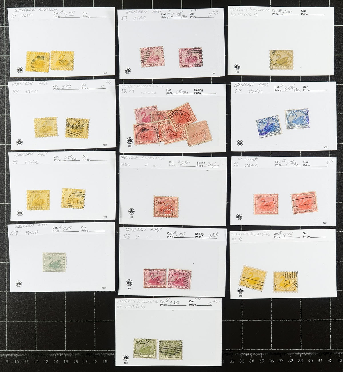 Group of mint and used stamps in roughly 130 dealer 102 cards, generally ranging from the late 1860's to 1900's. The group has representation from all the states, except Victoria, with each card identified by Scott numbers and have older catalogue values, typically one stamp per card, with a few ranging from 2 to 5 stamps per card. Most of the cards have catalogue values ranging from to $4 to $20 each and up, with a total value of US$1,131.65. A few small faults with a few stamps, still a nice lot for the Australia or Commonwealth collector, overall fine to very fine. Estimate =