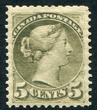 F/VF centered mint original gum, lightly hinged 5c slate green Small Queen, perforated 11 1/2 x 12. Well centered within balanced tight margins, but with some slightly shorter perfs UR corner. The original owner noted that this has a Greene Certificate, but we did not find it when sorting the estate. A scarce mint single, conservatively valued as fine (VF is $1500.00 catalogue). 2026 Scott Classic US$1,250.00 =