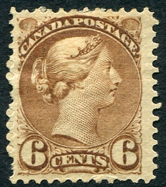 Fresh, sound and fine mint original gum, hinged example of the 1872 issue 6c yellow brown Small Queen. An elusive QV mint issue. 2026 Scott US$600.00 =