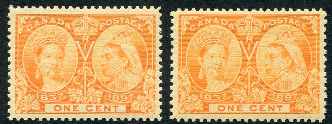 Duo of VF mint NH examples of the 1897 issue 1c Queen Victoria Jubilee, one in the orange shade, the other in the yellow orange shade. Not listed in Scott, but valued in Unitrade. 2025-2026 Unitrade =