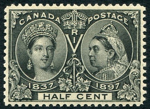 VF mint Never Hinged example of the 1/2c black 1897 Queen Victoria Jubilee issue, with Post Office fresh colour. A very nice example of this issue, minor natural gum bend, mentioned strictly for the record. Unitrade catalogue for VF NH is $450.00. 2026 Scott US$275.00 =