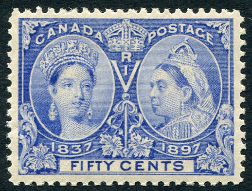 VF mint Never Hinged example of the 50c ultramarine Queen Victoria 1897 Jubilee issue. A tough stamp to find in Never Hinged condition, with some minor gum bends, noted strictly "for the record". A lovely stamp. 2026 Scott US$775.00 =