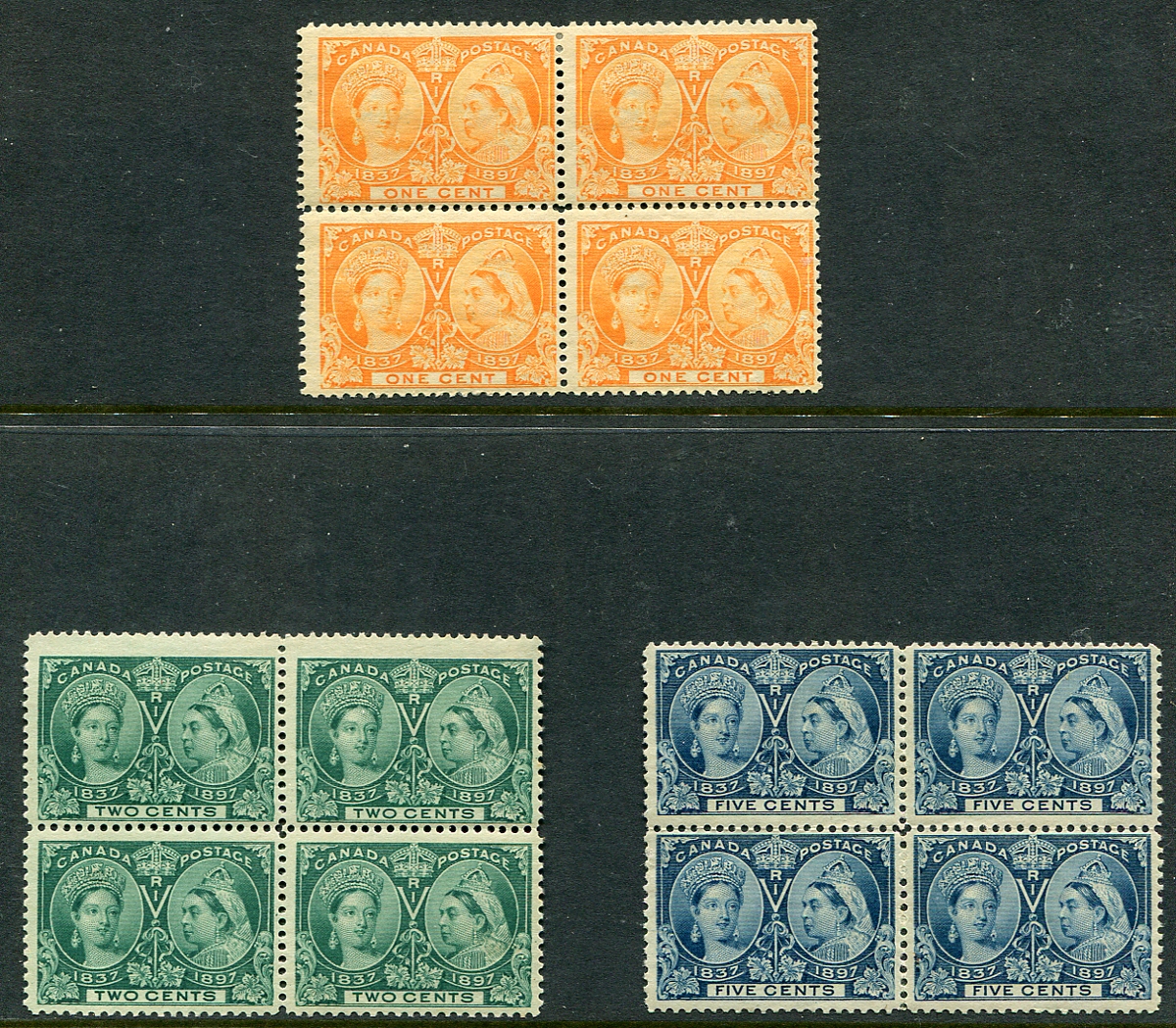 A trio of mint blocks of four from the 1897 Queen Victoria Jubilee series, including the 1c yellow, 2c green and 5c deep blue. The 2c block in Lightly Hinged (all four stamps), while the 1c and 5c blocks are Lightly Hinged on top, Never Hinged on bottom. 2026 Scott US$900.00 =