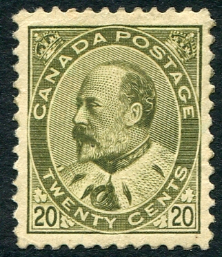 VF centered mint OG hinged / hinged remnant example of the 20c olive green 1904 issue Edward. Unitrade is $1,000.00 for VF mint hinged. An exceptional stamp. 2026 Scott US$750.00 =