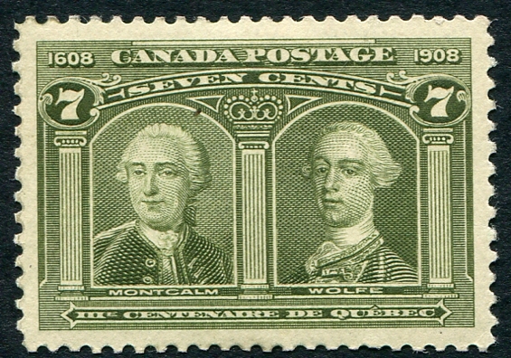 VF mint Hinged example of the 7c olive green "Wolfe and Montcalm" from the 1908 Quebec Tercentenary set. A great stamp if you don't want to pay the hefty NH premium. 2026 Scott US$140.00 =