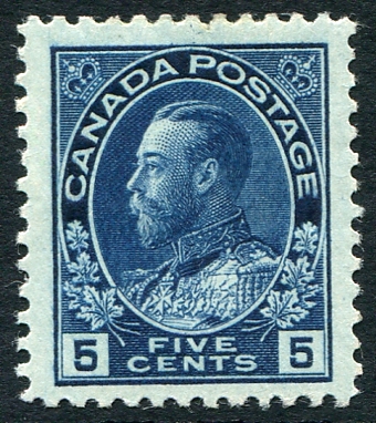 Very Fine mint Hinged example of the scarce indigo shade of the5c KGV Admiral (1st printing Jan 17, 1912). Considered by many to be the key shade of the key Admiral value. 2026 Scott Classic US$500.00 =
