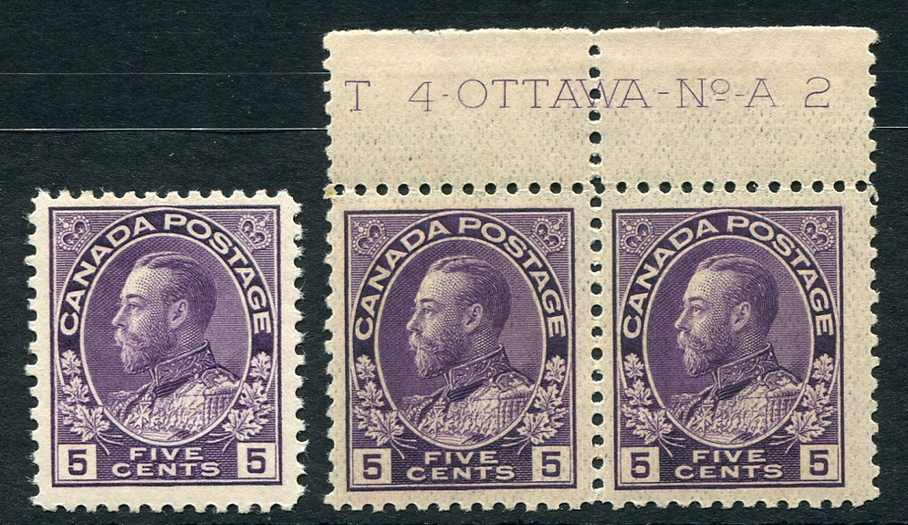 F/VF mint trio of 5c violet George V Admirals, including the 1922 issued single (wet printing) very Lightly Hinged, and then a sheet-margin (partial inscription) pair of the 1924 issue on Thin Paper (Never Hinged). 2026 Scott US$215.00 =