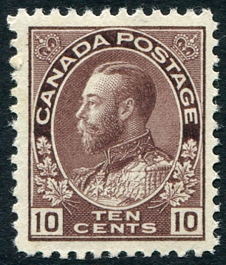 Fresh and Very Fine mint example of the 1912 issue 10c plum George V Admiral. A key Admiral value. While the stamp is Never Hinged, there is a small area of gum loss on the lower left corner, so valued as hinged. 2026 Scott US$275.00 =