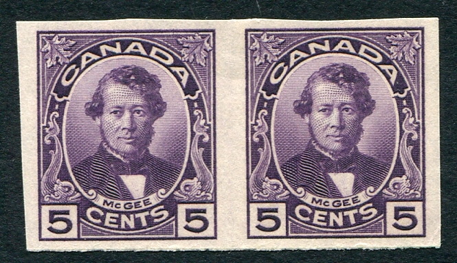 VF mint Never Hinged imperforate pair of the 5c violet McGee commemorative from the popular 1927 "Historical" series. Only 250 pairs issued, with few of the remaining pairs as nice as this. Unitrade catalogue is $240.00 for a VF mint NH imperf pair. Undervalued in our opinion. 2026 Scott US$180.00 =