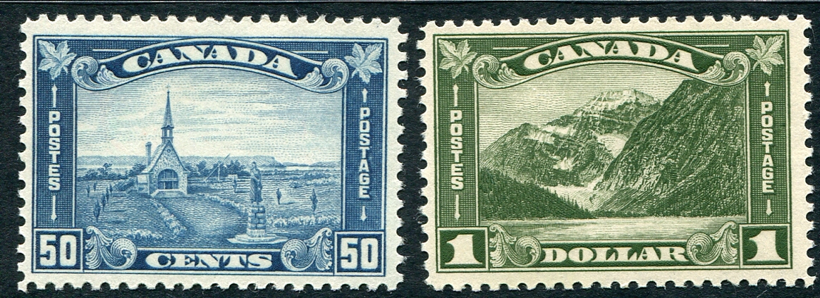 Fresh and Fine mint Lightly Hinged examples of the 1930 issue dull blue 50c Grand Pre and dark olive green $1.00 Cavell high values from the GeoV Arch series. 2026 Scott US$350.00 =