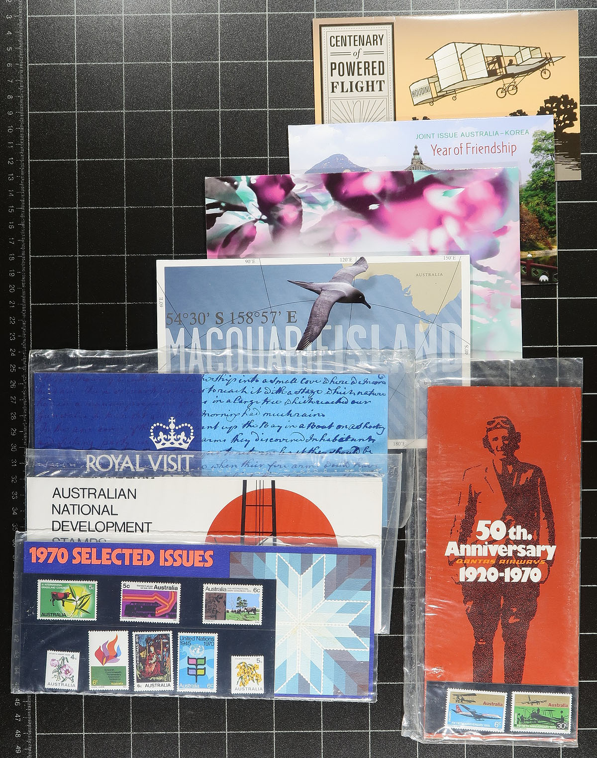 Group of roughly 90 Australia presentation packs, 1970's-1990's, containing several never hinged sets and a few souvenir sheets. A spot check of material indicated a few items cataloguing $7 to $10 each, face value alone is roughly $225 to $250. A lovely lot for thematic and topical collectors as we note many suitable subjects. A clean and very fine lot. Estimate =