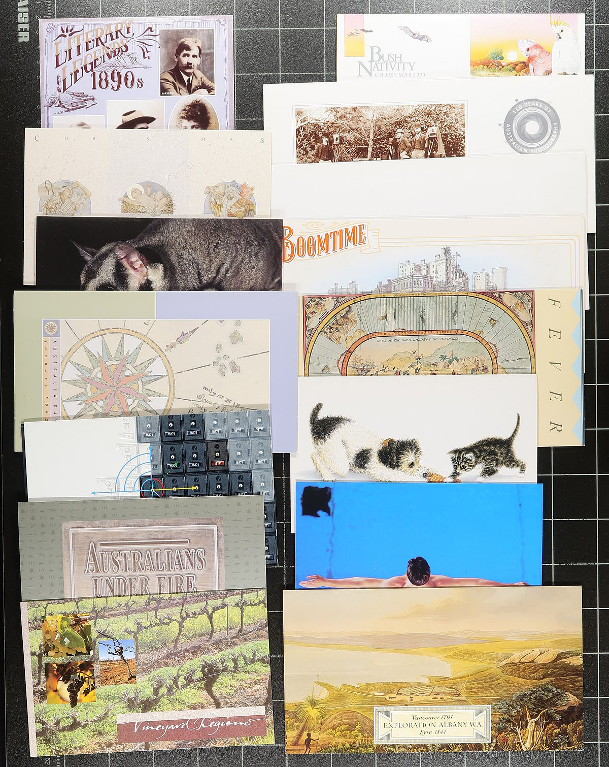Group of roughly 90 Australia presentation packs, 1970's-1990's, containing several never hinged sets and a few souvenir sheets. A spot check of material indicated a few items cataloguing $7 to $10 each, face value alone is roughly $225 to $250. A lovely lot for thematic and topical collectors as we note many suitable subjects. A clean and very fine lot. Estimate =