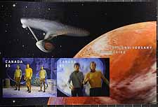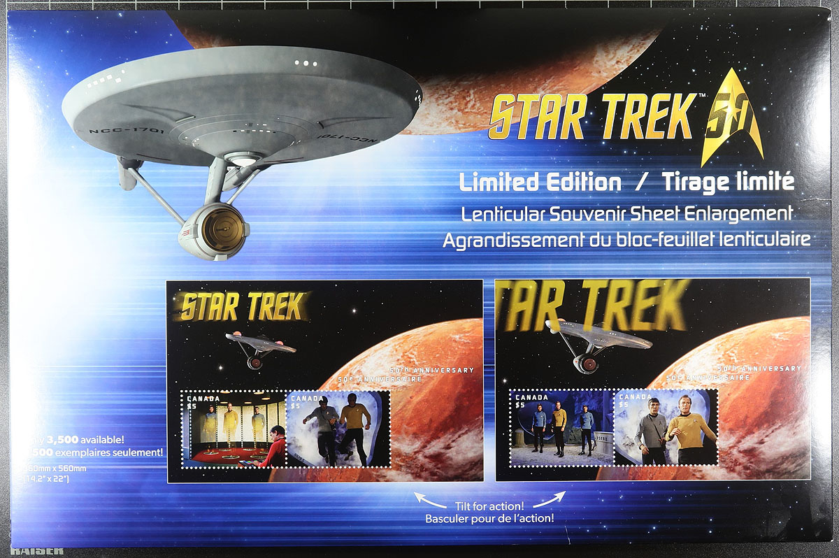 After not seeing one of these in years, we are offering a second example, in as many months of the seldom seen 2016 "Enlargement" of the lenticular Star Trek souvenir sheet, measuring 560mm x 360mm issued by Canada Post. Unlike other stamp reproductions, this large sheet does not have the value demonetized, so the "stamps" would appear to be valid for postage (just try to find an envelope large enough!). While not given a value in Unitrade, it is mentioned below the #2922 entry. Only 3500 were produced. Original issue price =