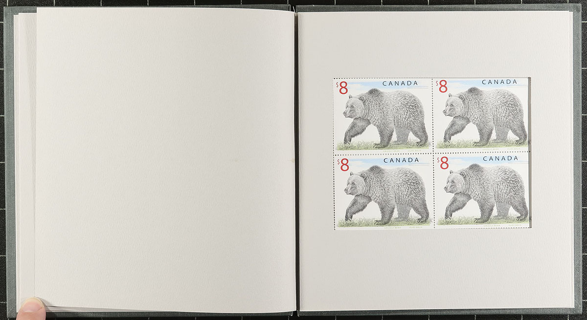 The 1998 issue $8.00 Grizzly Bear in the limited edition (2,500) hard cover presentation folder. Contains a MNH pane of four of the $8.00 stamp signed by both artist and designer as well as a special edition signed engraving of the bear alone. An undervalued Canada Post product, which regularly sells for over catalogue value (note, the catalogue value on this has not change in 20+ years). 2025-2026 Unitrade =