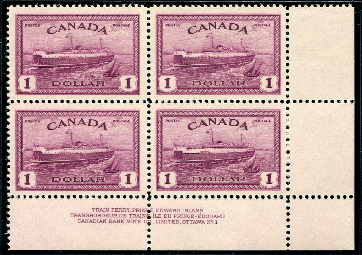 VF mint upper-left inscription block (Plate #1) of the 1946 Peace issue $1.00 Train Ferry. Lightly hinged in the selvedge and on one stamp only. Catalogued as a VF mint Hinged plate block. 2025-2026 Unitrade =