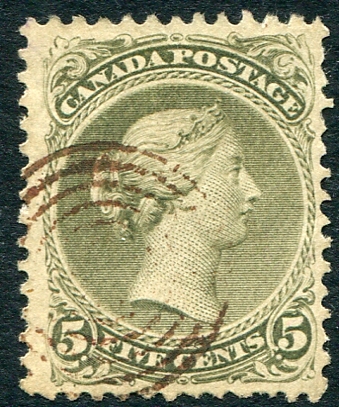 F/VF used example of the 1875 issue 5c olive green Large Queen exceedingly rare perf 12 x 12. Considered by many to be the key Large Queen value. Missing from most collections. 2026 Scott US$1,000.00 =
