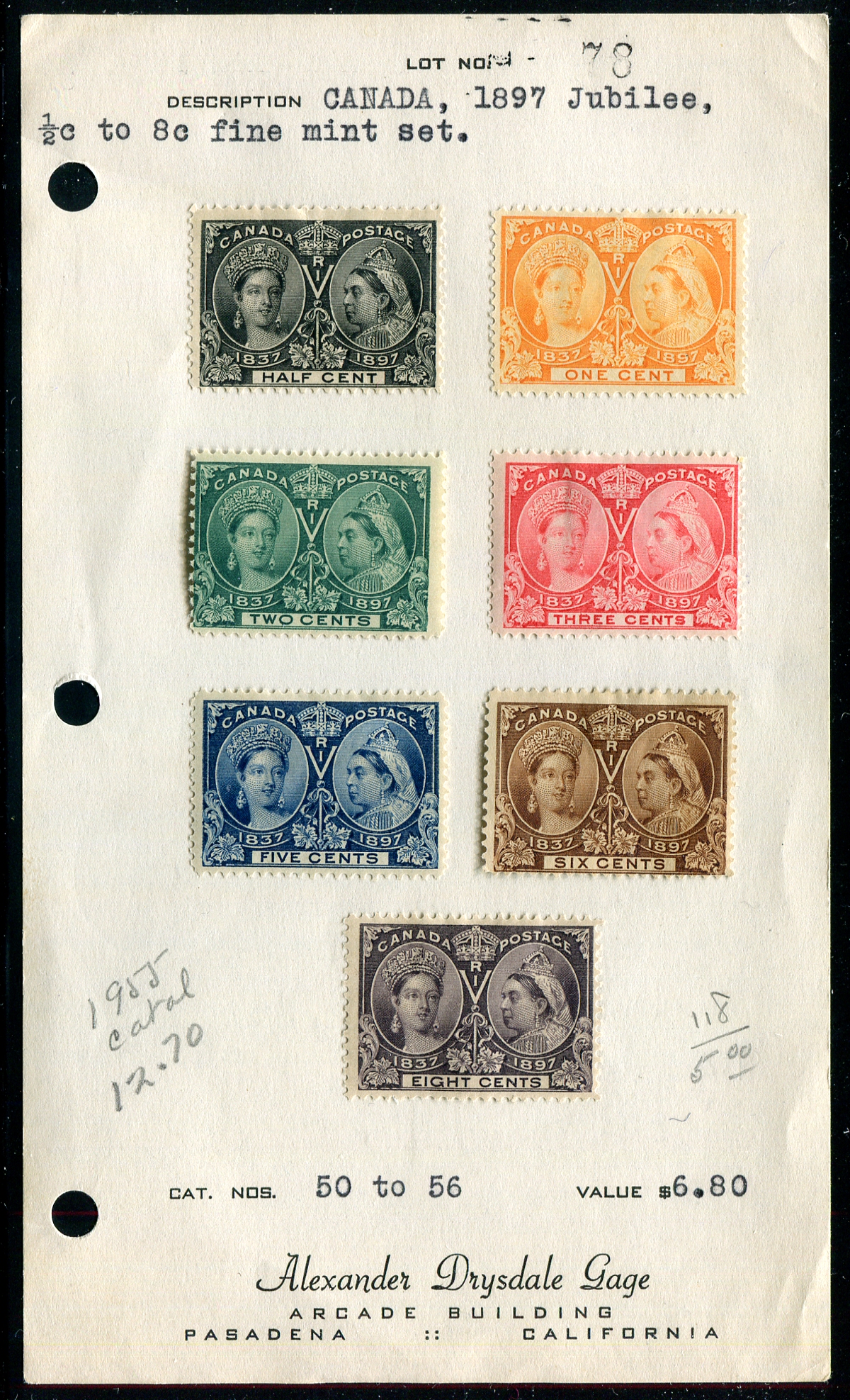 An interesting old-time Auction Lot card bearing 7x different 1/2c to 8c Queen Victoria 1897 Jubilee stamps, from "Alexander Drysdale Gage" out of Pasadena, California, with 1955 catalogue value noted in pencil. The lot looks to have sold for $5.00, likely 70 years ago! 2026 Scott US$627.50 =