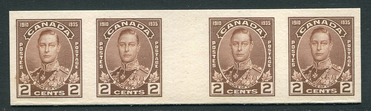 VF and extremely scarce horizontal gutter-strip of four of the 2c Duke of York, 1935 Silver Jubilee issue Plate Proof. The 1c, 2c and 5c values sheets were printed in 4 panes of 100, therefore only 32 possible horizontal gutter strips are possible. Unitrade values a gutter strip of 8 stamps, so we have pro-rated the catalogue value here. 2025-2026 Unitrade =